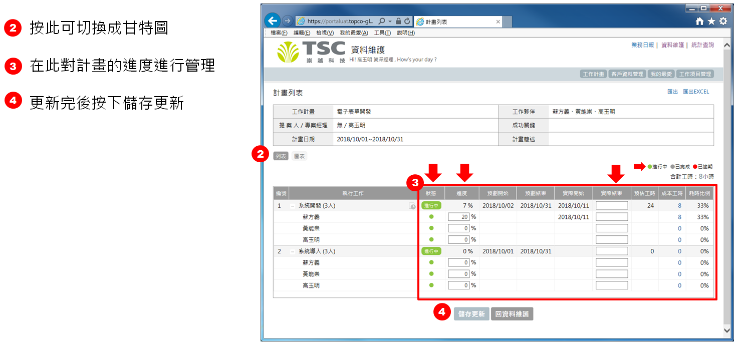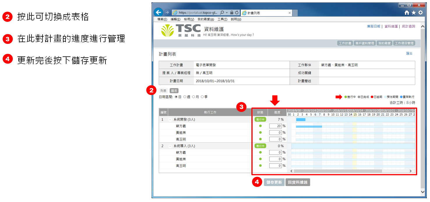 點擊計畫名稱,可以進到該計畫的計畫列表頁面,管理計畫進度下圖為表格的樣式,空格部分請PM填寫下圖為甘特圖的樣式,會根據PM填入的進度自行產生