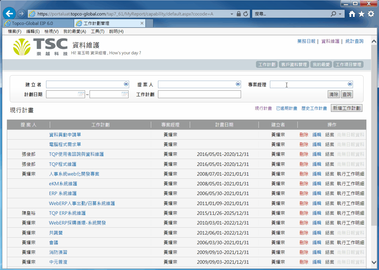 設定條件查詢工作計畫,以找到特定工作計畫下圖示範以專案經理為條件搜尋,建立人、提案人、專案經理三個欄位皆可輸入工號或是姓名,系統會帶出下拉選單下圖示範以計畫日期為條件搜尋,設定起訖時間後,會找出所有在此區間的計畫下圖示範以工作計畫為條件搜尋,輸入關鍵字後,會找出所有和此關鍵字相符的工作計畫如果要取消搜尋結果,有以下兩種方式