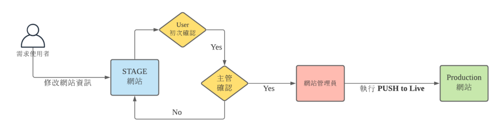 - 正常網站更新頻率:每月2次,每月第一與第三個星期三做 Push to Production 將 STAGE 網站更新上線為 Production 網站