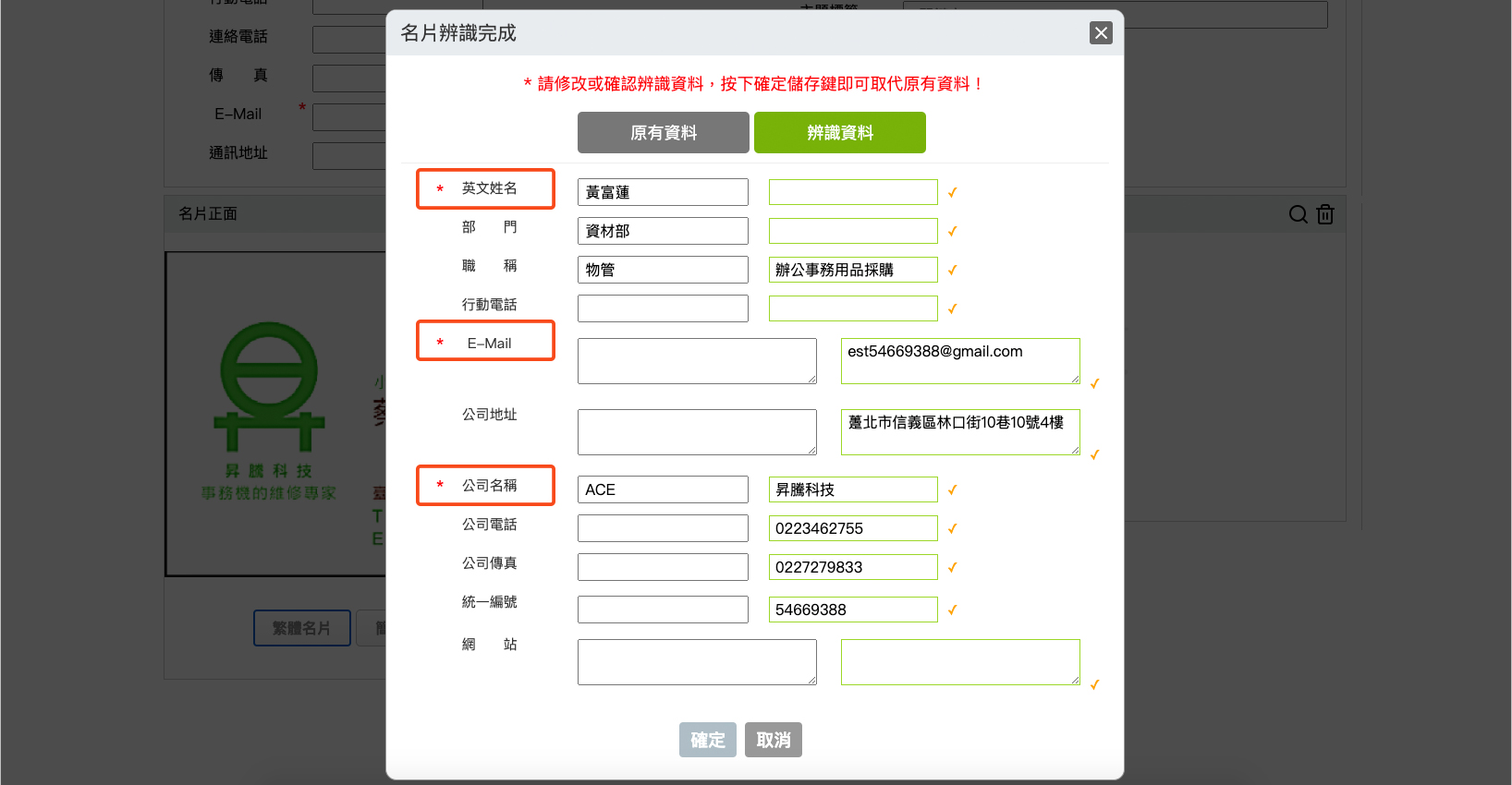 點選語系,選取名片圖檔,等候辨識結果。 * 姓名、公司名稱、email為必填項目。 * 校正欄位內容並按確定。