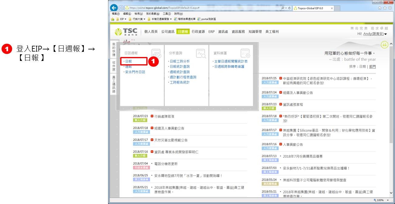 EIPv6 介面說明 個人化設定 1. 點選網站右上角的名字,再點選「個人化設定」 2. 勾選想要顯示的面板,拖拉位置來改變顯示順序 3. 勾選想要顯示的快捷圖示來添加到「我的快捷」面板中 亦可點選拖拉快捷圖示來改變顯示順序 4. 面板可以全部收合起來 亦可設定開啟EIP首頁時預設全部收合 亦可預設全部展開